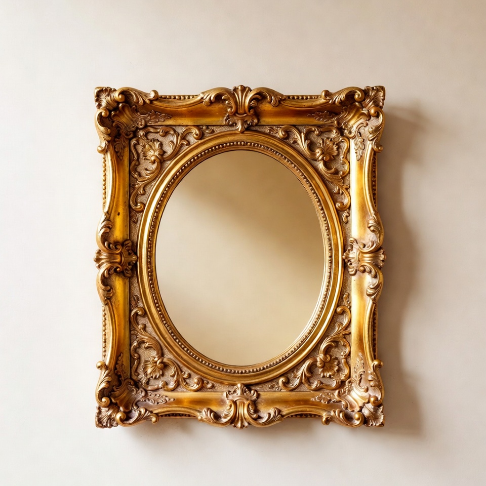 A golden, ornate mirror hangs on a wall. The frame has detailed carvings and a smooth reflective surface showing the wall behind it.