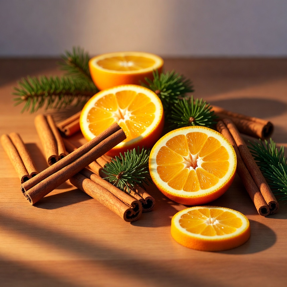 Slices of oranges and cinnamon sticks are arranged on a wooden table with pine branches beside them in natural light.