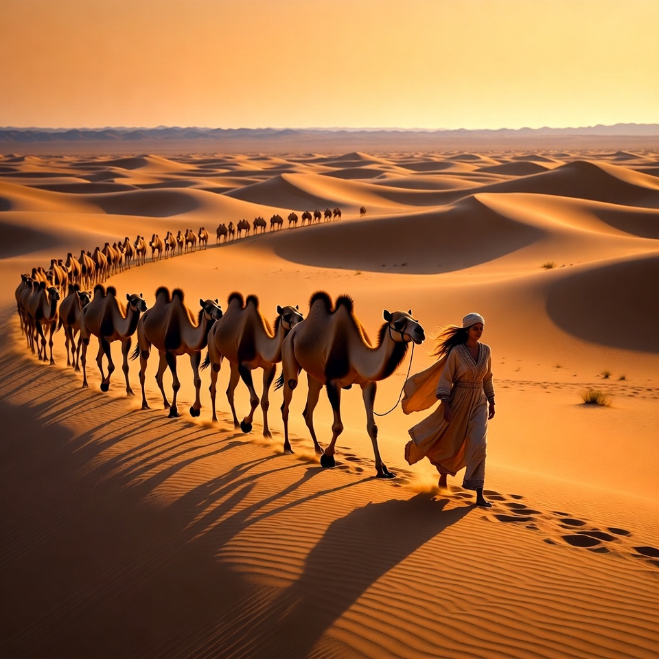 A person leads a line of camels through sand dunes as the sun sets, casting long shadows. The scene shows a vast desert landscape.