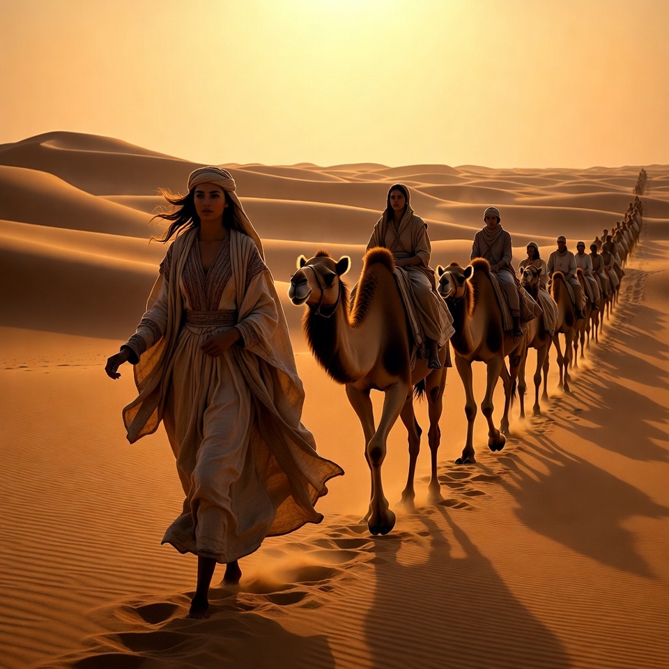 Group of people walks in a line with camels across the sandy desert during sunset, casting long shadows on the ground.