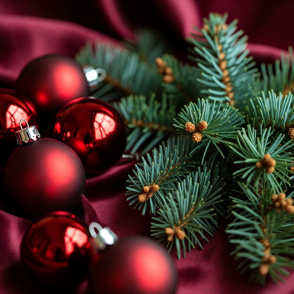 Red ornaments and pine branches are arranged on a dark tablecloth, showing festive spirit during the holiday season.