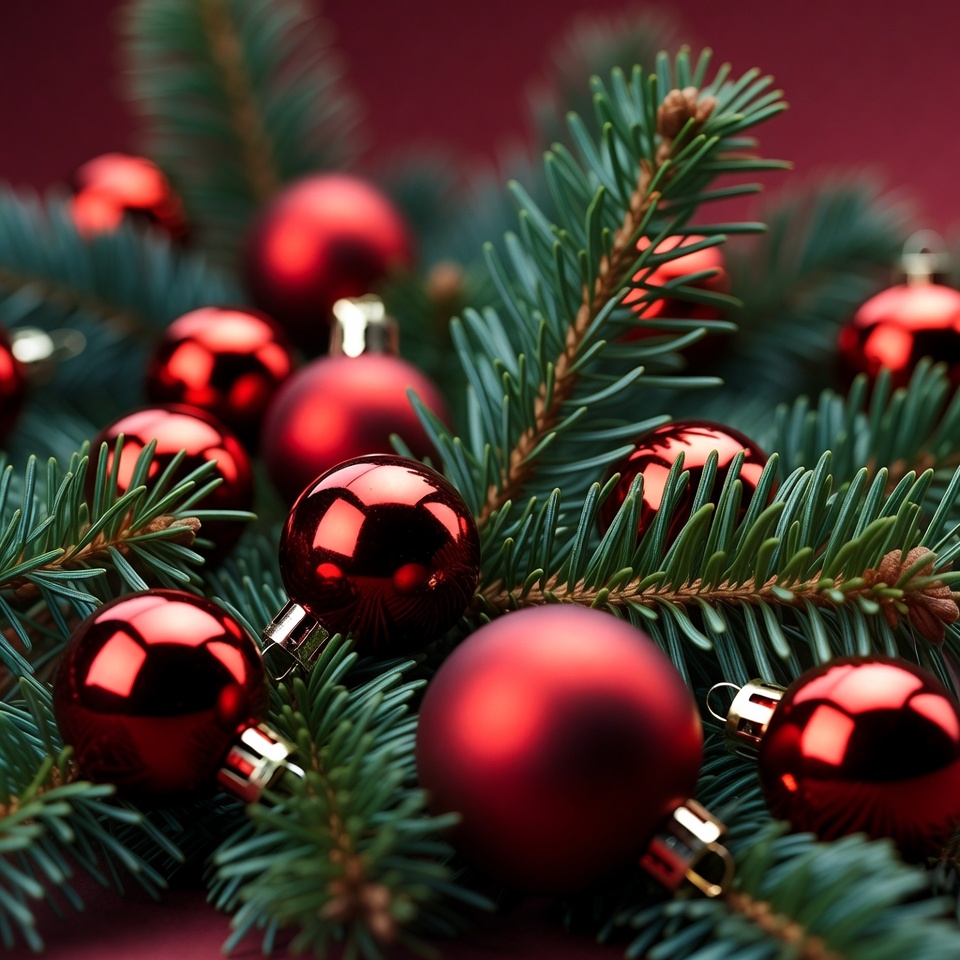 Red Christmas ornaments rest among green pine branches on a table. This scene captures the festive spirit and holiday decoration.