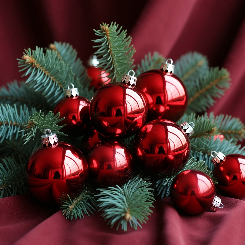 Red ornaments rest on green pine branches against a dark background. The scene shows festive colors suitable for holiday decoration.