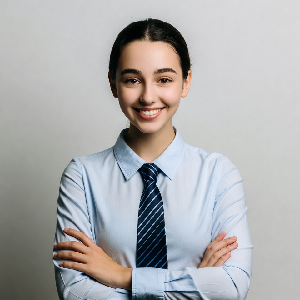 arms crossed, background, business, casual, clothing, confidence, expression, hairstyle, light blue, office, personal, portrait, professional, shirt, smile, standing, style, tie, woman, youthful