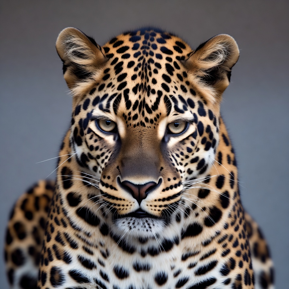 A leopard stares directly at the camera. Its fur is covered in spots. The background is plain and focuses on the leopard's face.