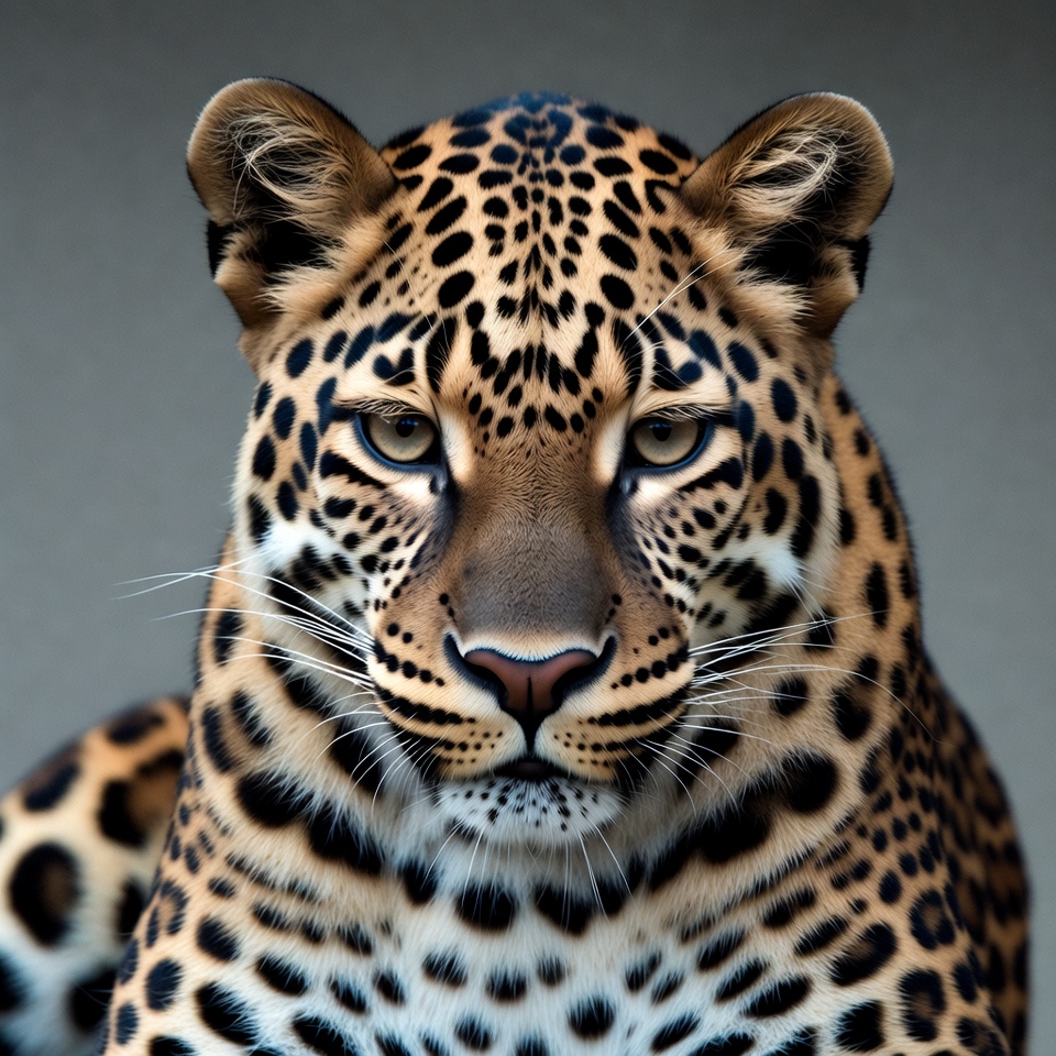 A leopard stares at the camera in a focused manner, showcasing its distinctive spots and facial features, in a controlled environment.