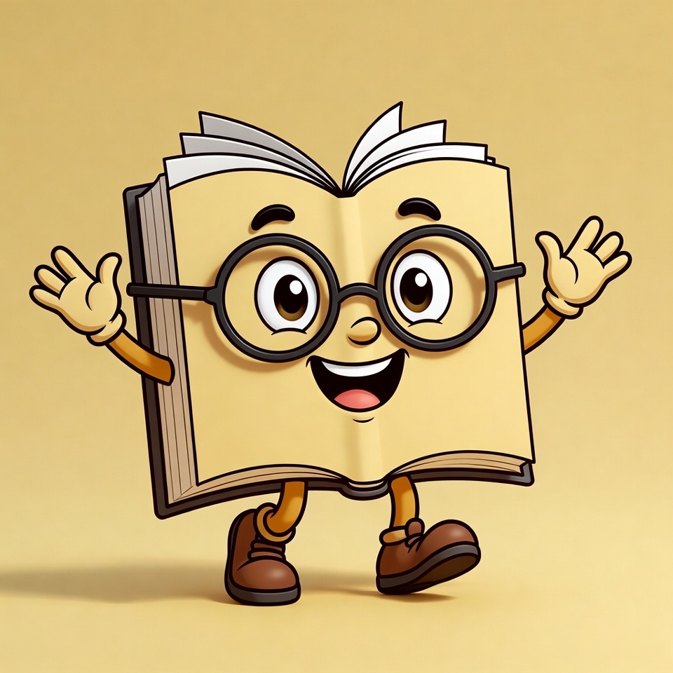 A book character with glasses and arms smiles and walks. The character has a cheerful expression on a plain background.