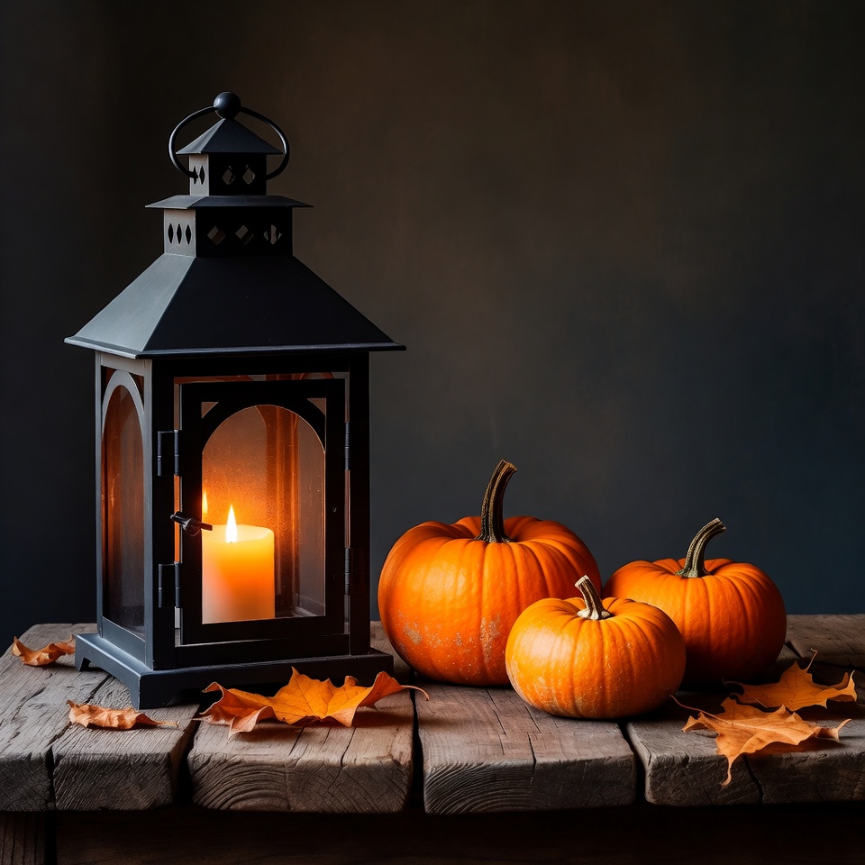 A black lantern holds a candle near orange pumpkins. Autumn leaves surround them. The scene is set indoors with a dark background.