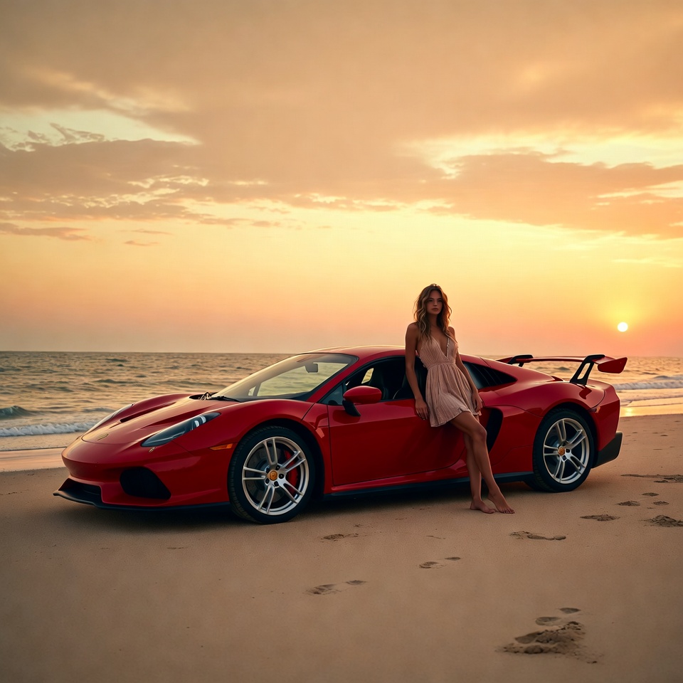 automotive, beach, car, coastline, colors, evening, horizon, lifestyle, nature, ocean, recreation, relaxing, sand, sky, standing, summer, sunset, transportation, waves, woman