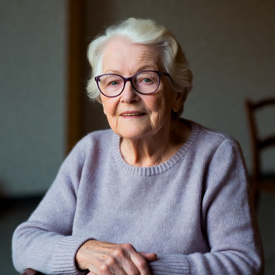 An elderly woman sits at a table and smiles. She has gray hair and glasses. Natural light comes from a nearby window creating a warm atmosphere.