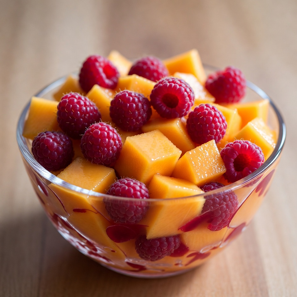 A clear bowl holds fresh raspberries and diced cantaloupe. The fruit is bright and ready to eat.