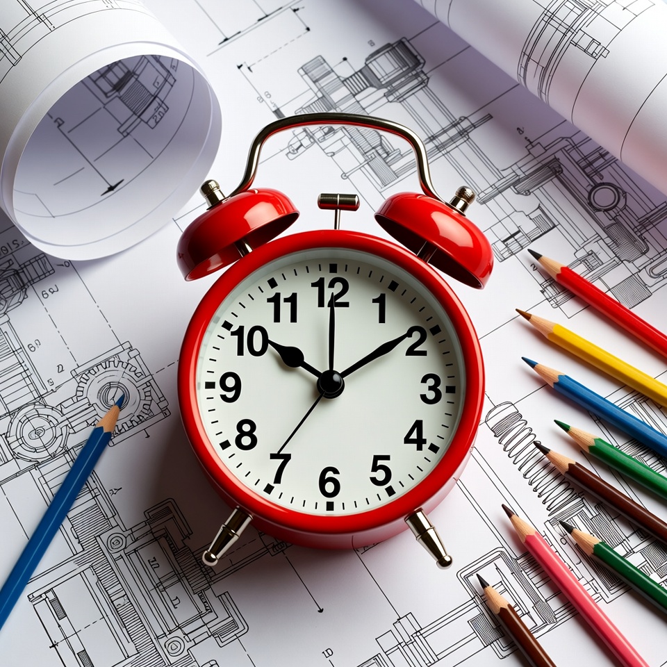A red alarm clock sits on top of technical drawings, surrounded by colored pencils, suggesting a focus on time and design.