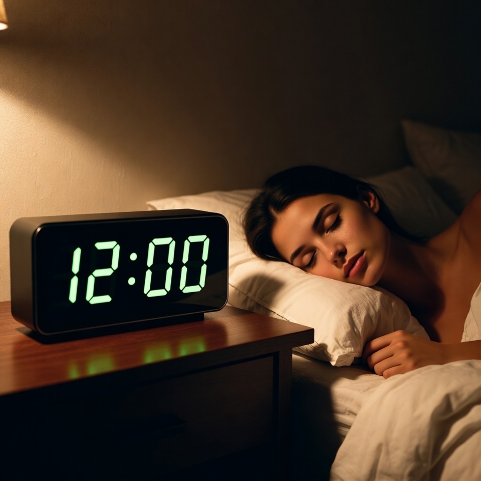 A woman sleeps in a dark room next to a bedside table with a green digital alarm clock displaying twelve o'clock.