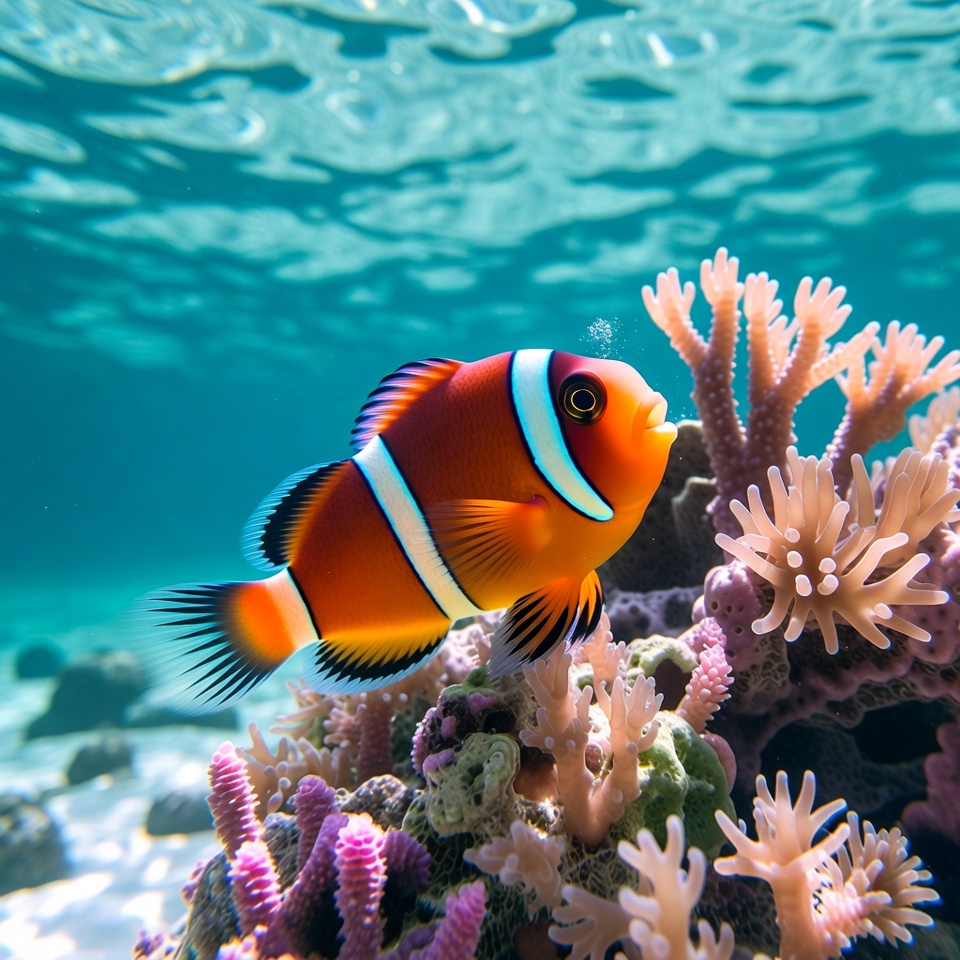 A clownfish swims among colorful corals in clear ocean water. Sunlight filters through the surface, creating a vibrant underwater scene.