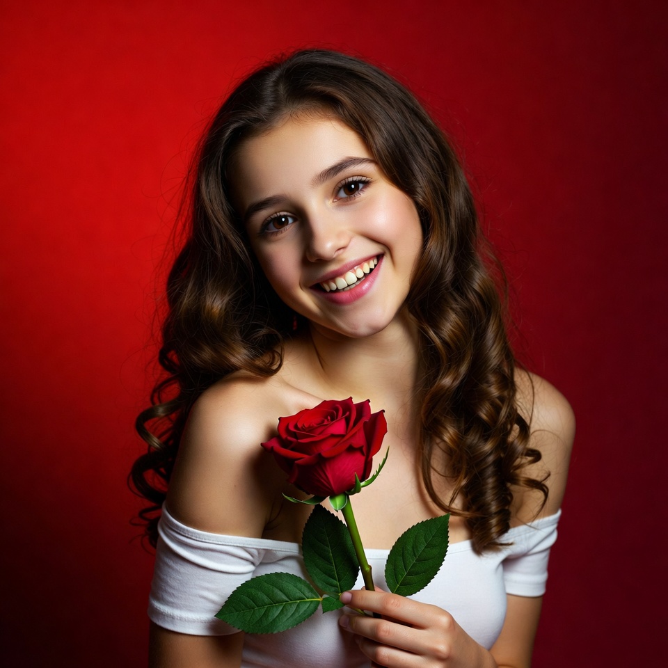 A girl smiles while holding a red rose against a red background. The scene captures her happiness and the vibrant color of the flower.