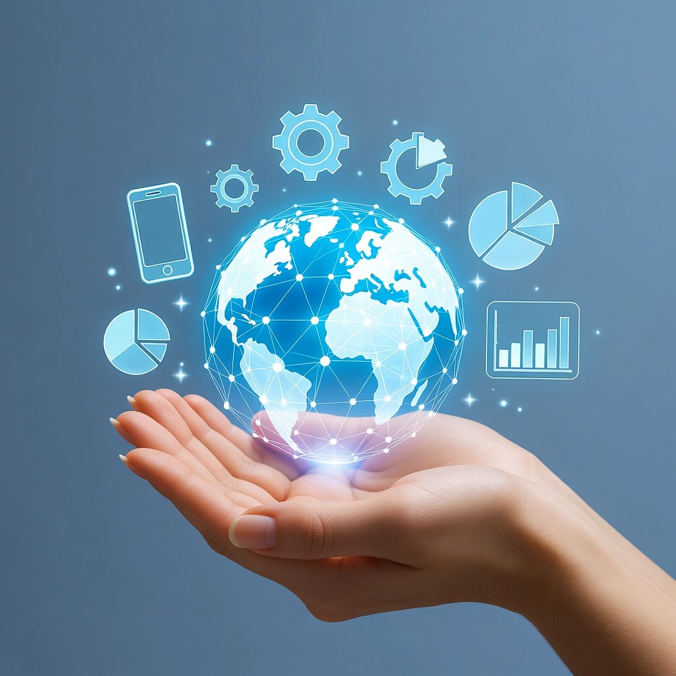 A person holds a glowing globe surrounded by icons. This scene shows a connection between the world and digital technology.