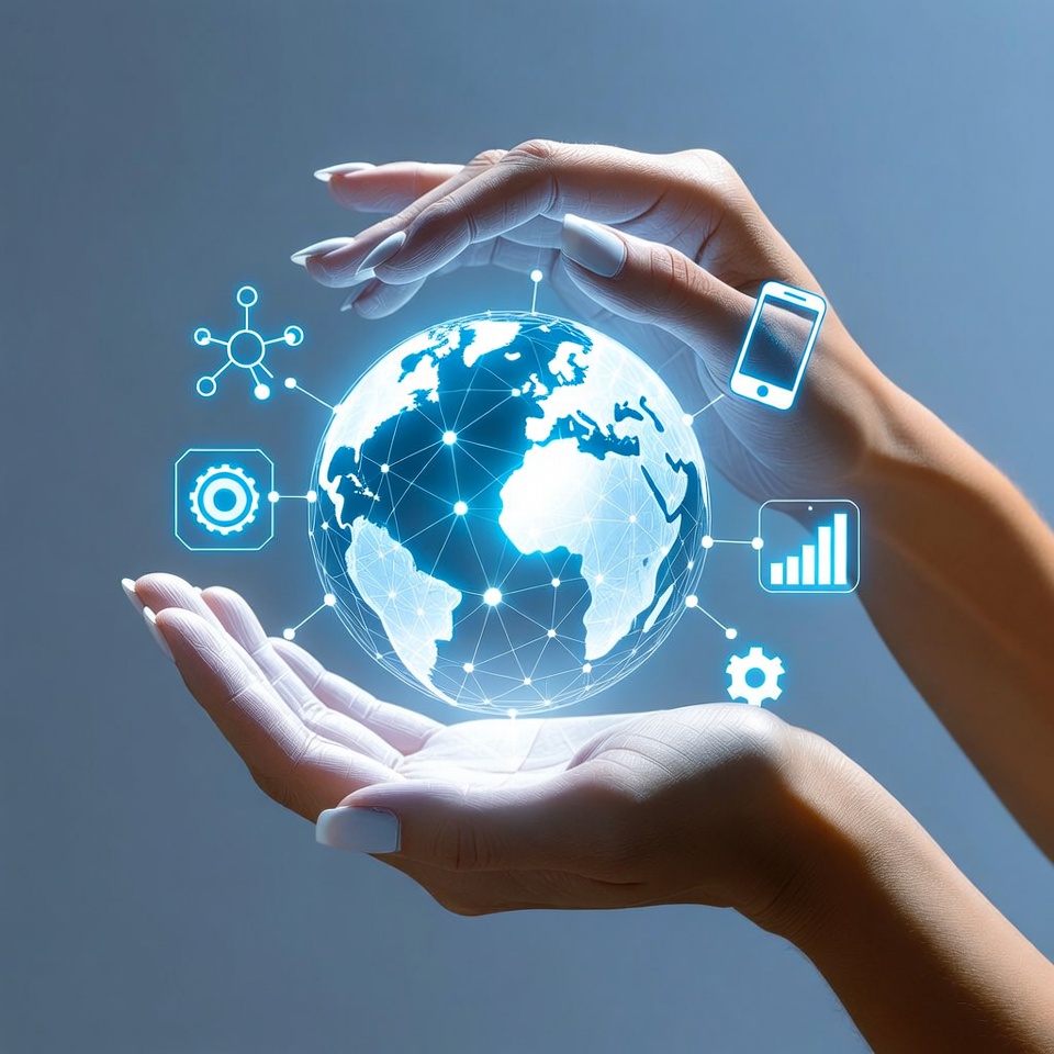 Two hands hold a glowing globe with technology symbols. This display represents global connectivity and digital innovation.