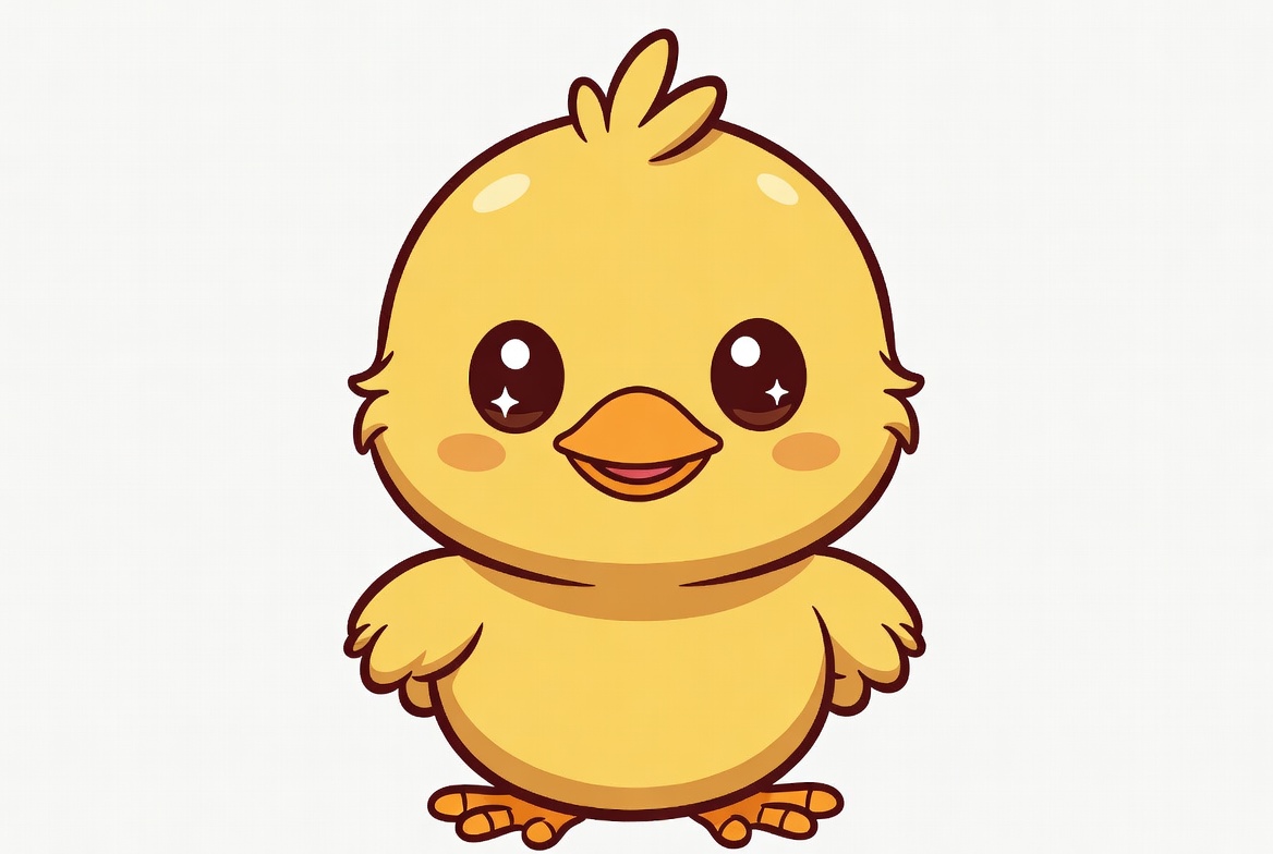 A small yellow chick stands with wings slightly outstretched. It smiles and has bright eyes. The background is simple and light.