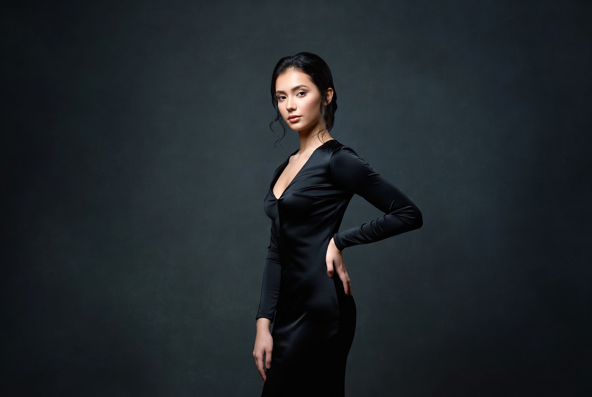 beauty, black dress, body language, casual pose, confidence, dark background, elegance, expression, fashion, grace, hairstyle, lighting, model, portrait, posing, simplicity, straight hair, studio, style, woman