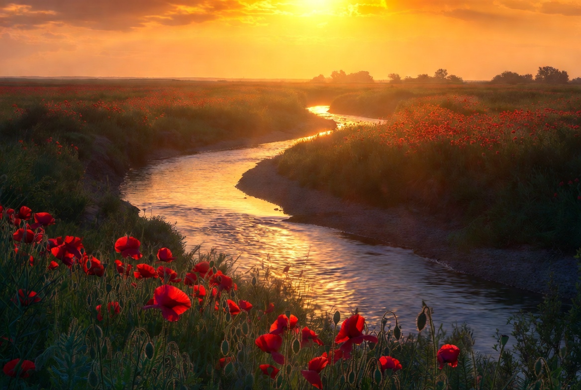 A river flows through a field of red poppies at sunset. The sky shows orange and yellow colors as the sun sets over the landscape.
