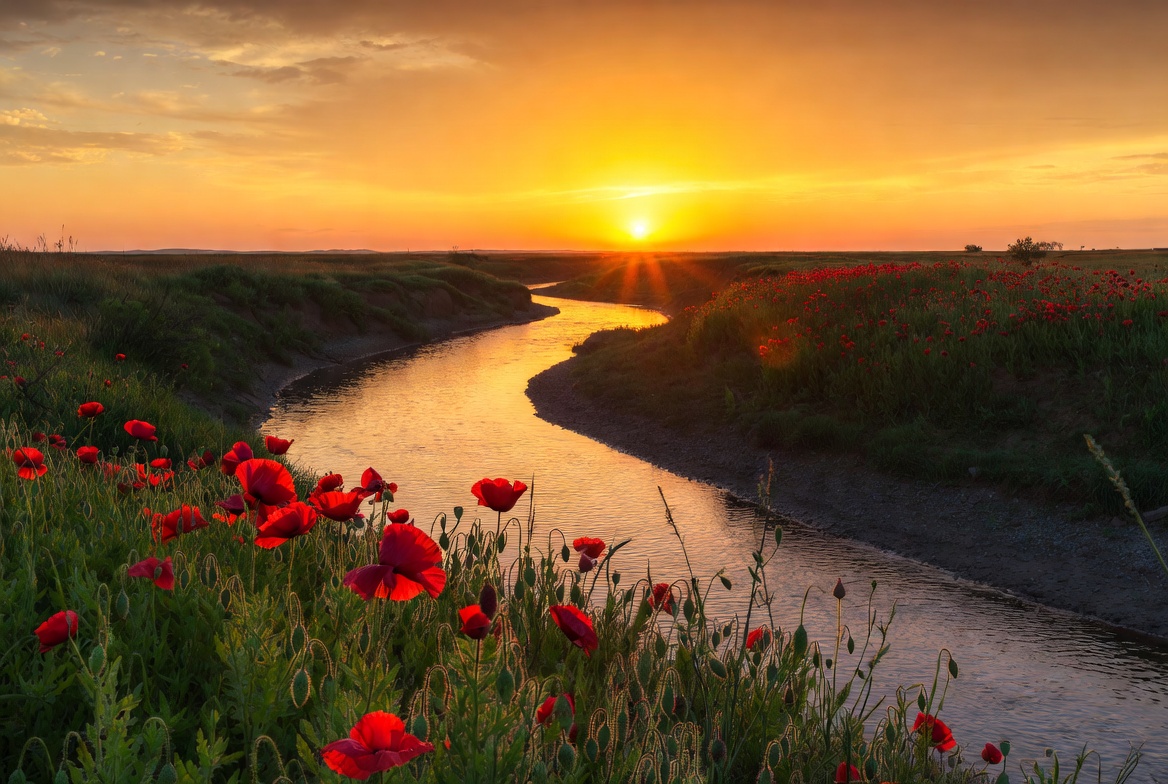 beauty, clouds, colors, evening, fields, flora, flow, flowers, horizon, landscape, lighting, nature, outdoors, poppies, river, scene, sky, summer, sunset, water