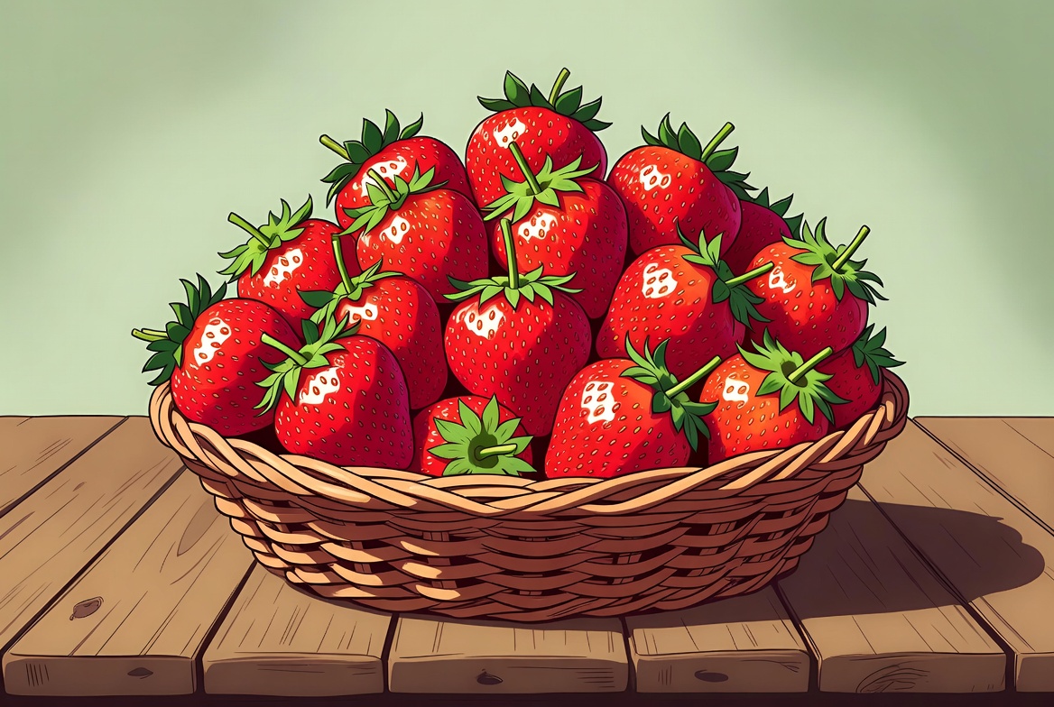 A basket filled with ripe strawberries sits on a wooden table. The berries are bright and ready to eat. Natural light highlights their color.