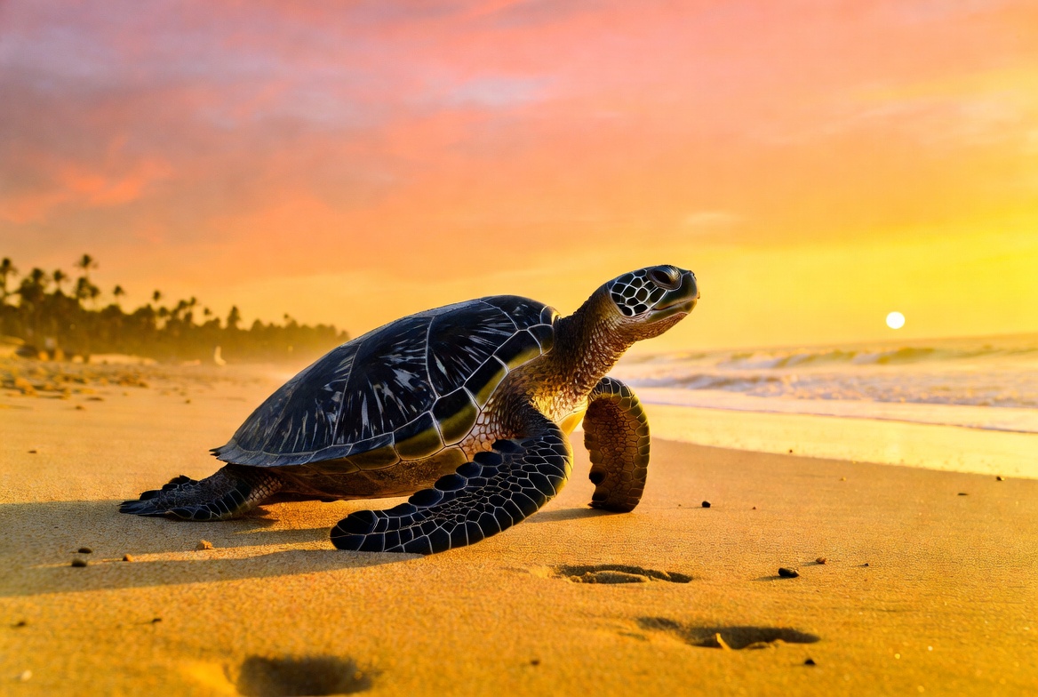 A turtle is crawling on the sandy beach as the sun sets on the horizon. Waves gently lap at the shore in the background.