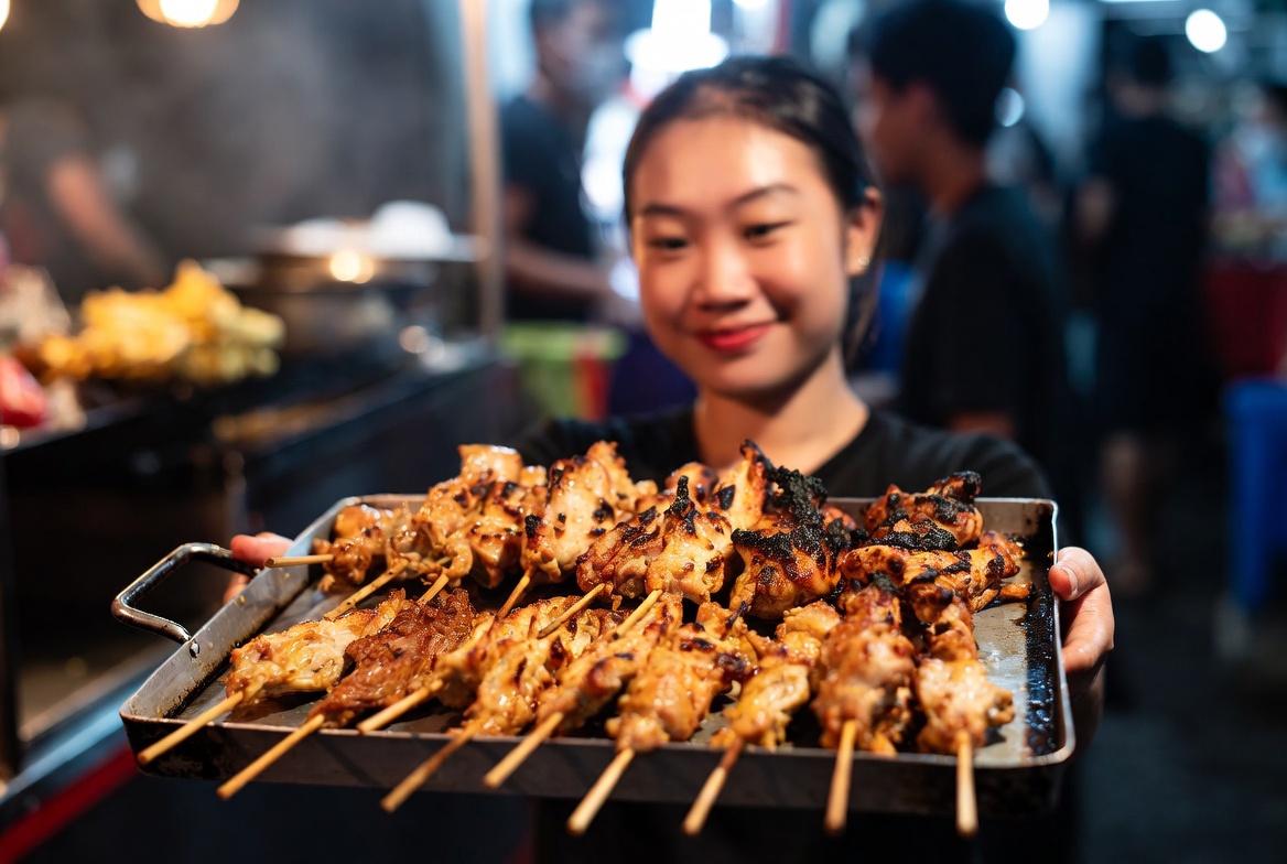 A vendor holds a tray of grilled chicken skewers at a busy night market. People are seen enjoying food in the background.