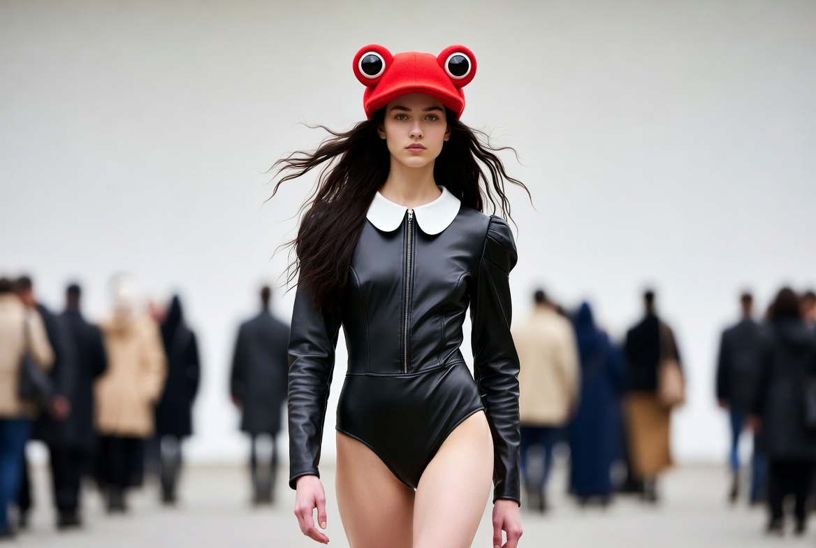 A model walks down the runway wearing a fitted outfit and a large red hat. The setting is a fashion event with a crowd in the background.
