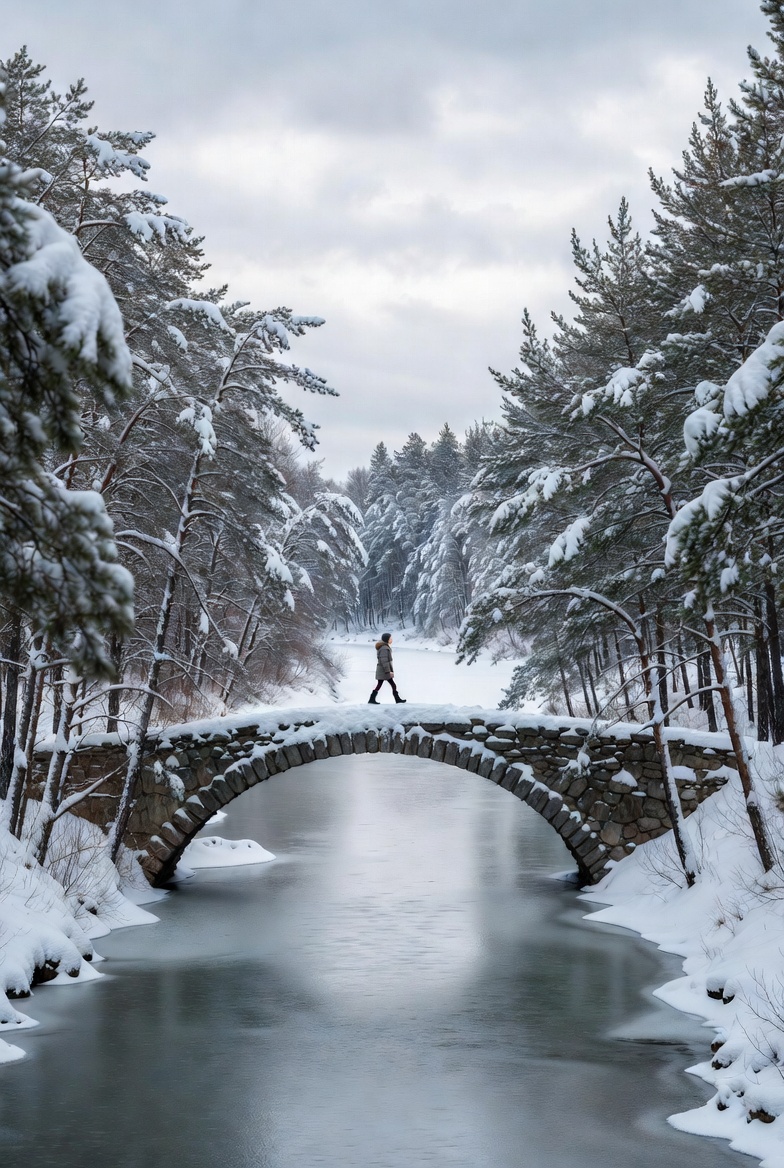 A person walks across a stone bridge covered in snow. Tall trees surround the scene. The river flows beneath the bridge in winter.