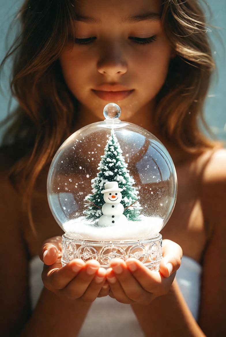 Girl holds a snow globe with a snowman and tree inside. The scene is bright with snow falling in the decoration.
