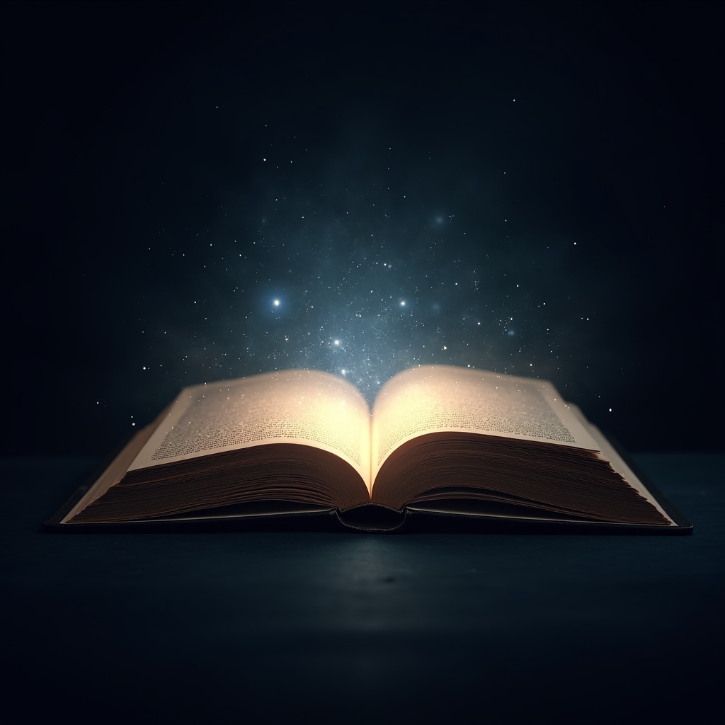 A book lies open with a glow, showing stars and light above its pages. The scene suggests imagination and stories waiting to be explored.