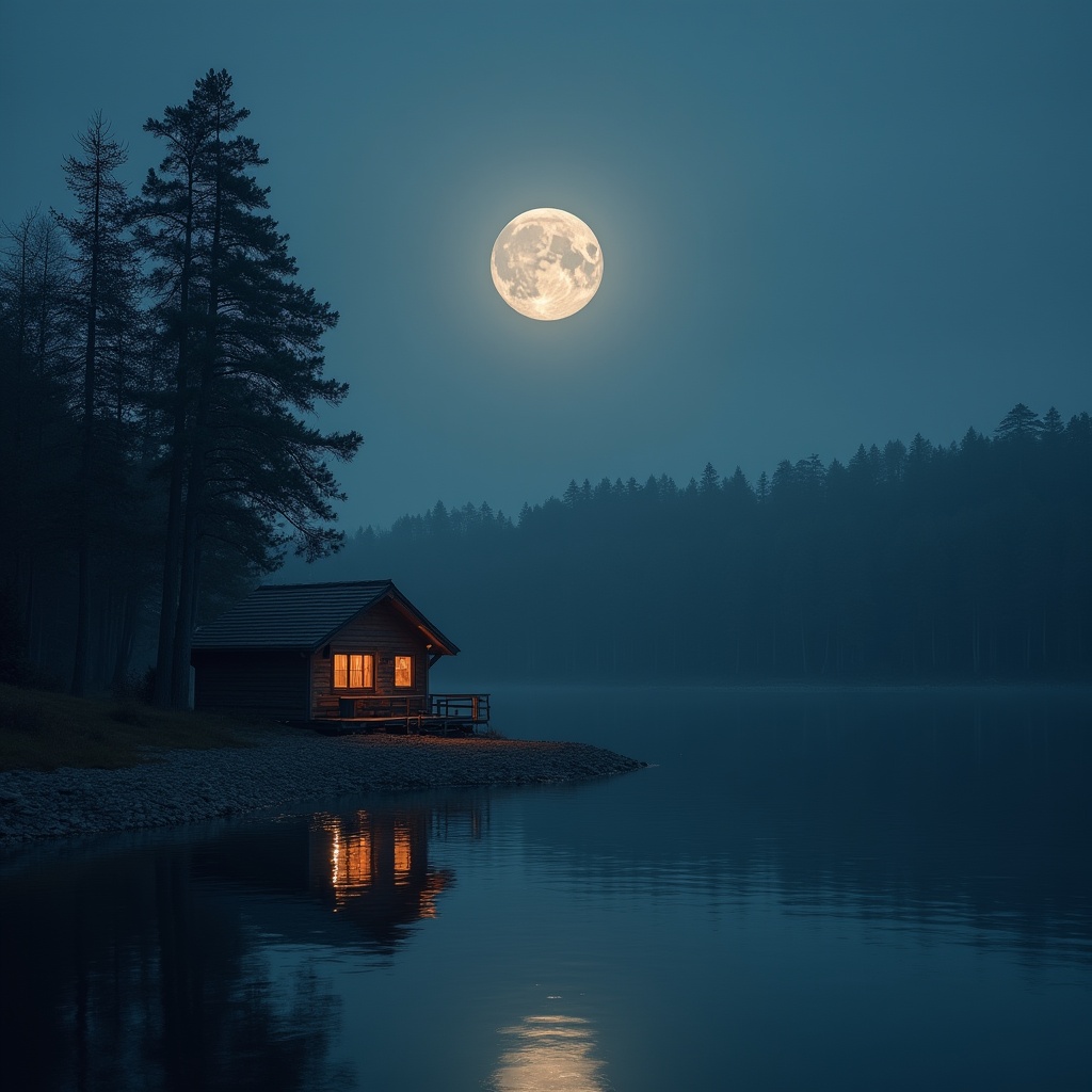 A wooden cabin sits beside a calm lake under a full moon, reflecting light on the water. Tall trees surround the area in the night.