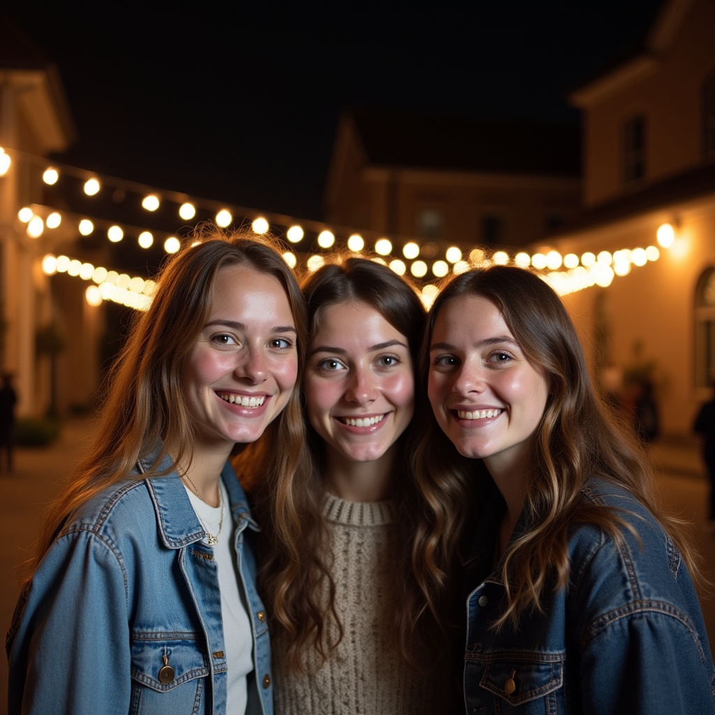 Three friends stand together, smiling under string lights at a nighttime gathering in an outdoor setting, surrounded by buildings.