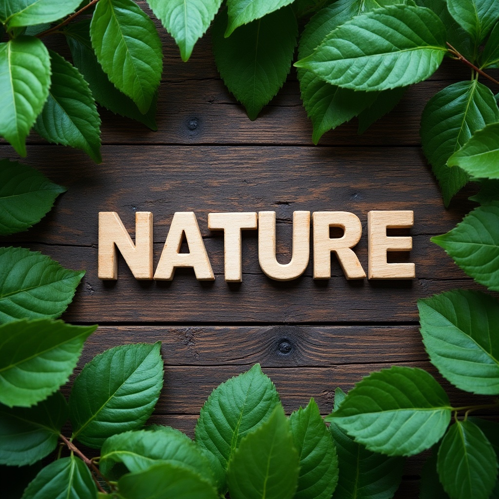 Wooden letters spelling nature are placed on a dark wood surface, framed by fresh green leaves. The setting highlights the theme of nature.