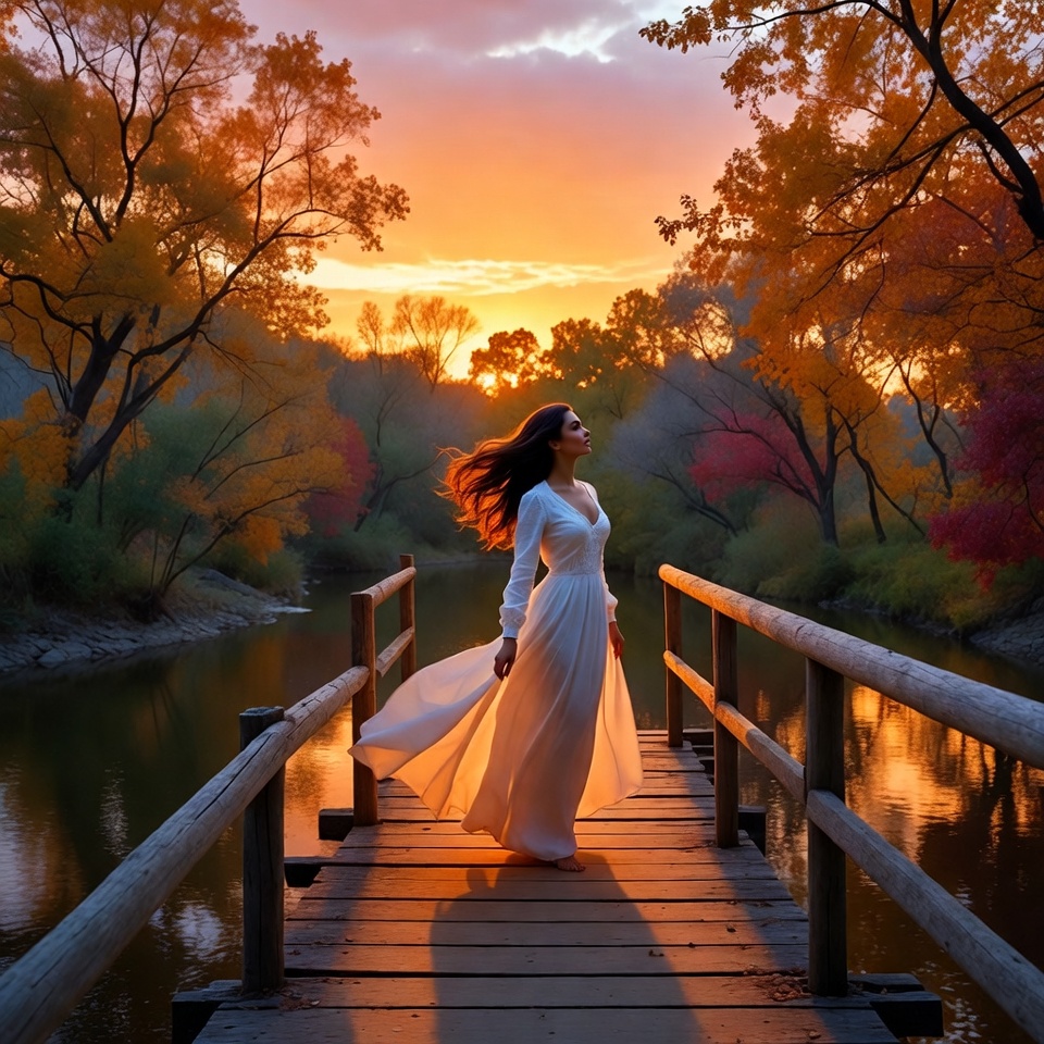 A woman in a long white dress strolls on a wooden bridge during sunset in autumn, surrounded by colorful trees and calm water.