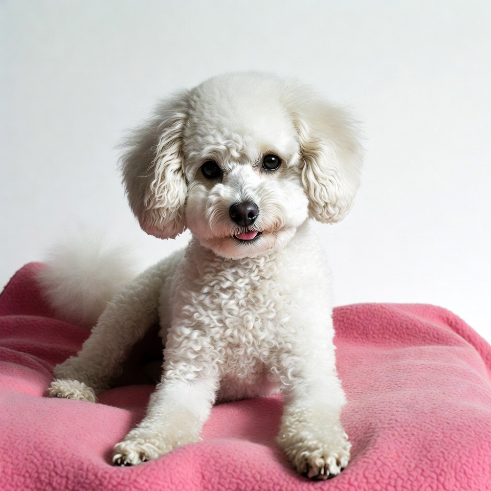 animal, blanket, breed, companion, curly, cute, dog, friendly, fur, indoors, looking, pet, pink, playful, relaxed, resting, sitting, small, soft, white