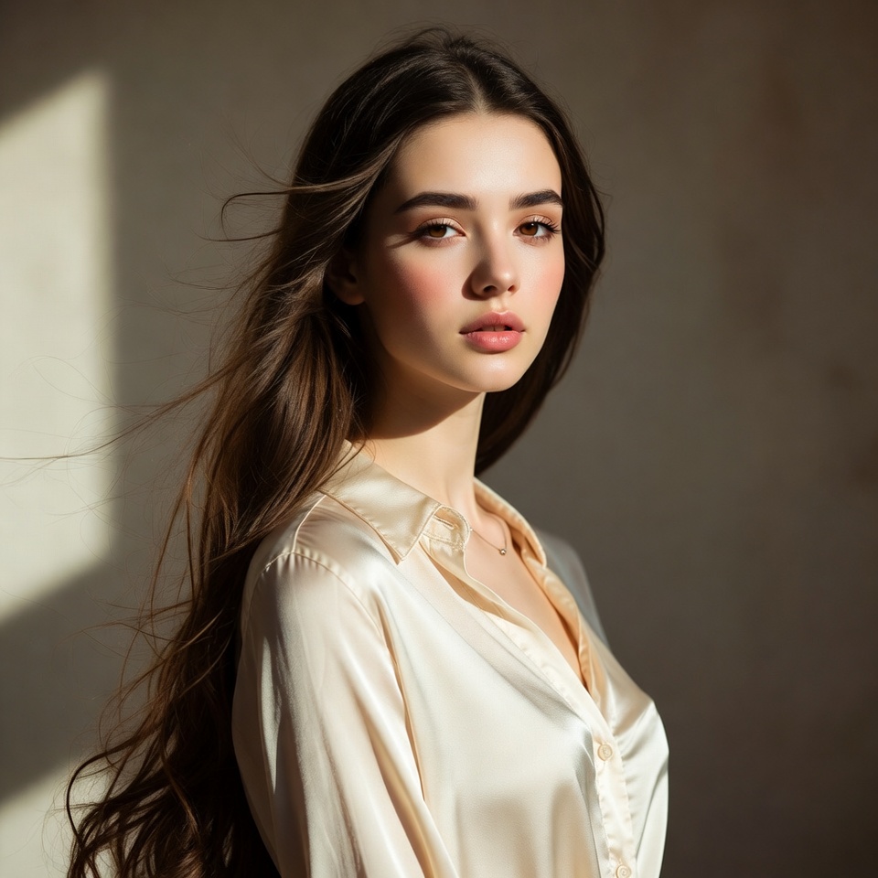 atmosphere, beauty, casual, elegant, fashion, grace, indoor, light, long hair, model, natural, portrait, pose, serenity, shirt, silk, soft light, style, warm, woman