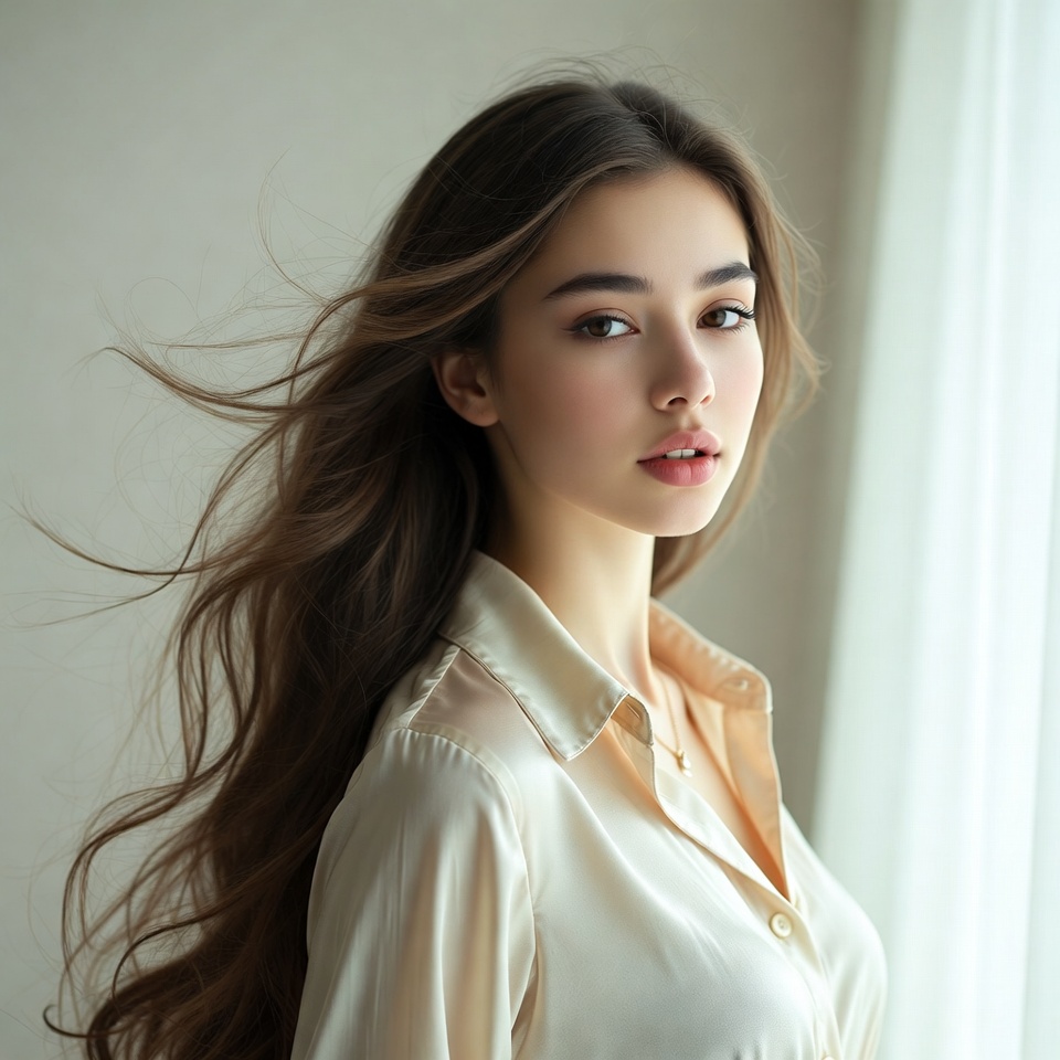 A young woman stands near a window, her hair flowing, wearing a silk shirt. Natural light highlights her thoughtful expression and features.