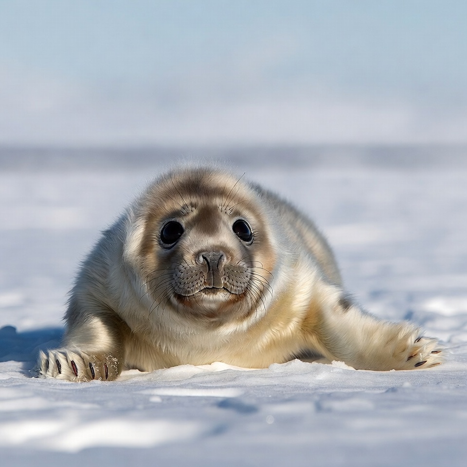 A young seal pup rests on the snow during winter. The white landscape contrasts with the soft fur of the animal.