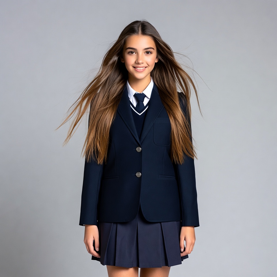 A young student stands confidently, wearing a school uniform that includes a blazer and skirt. Hair flows freely down the shoulders.
