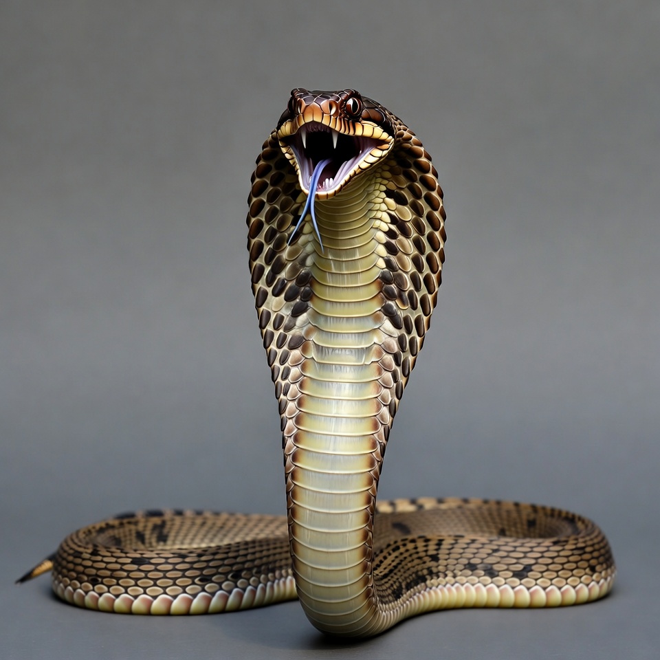 A snake shows its hood and flicks its tongue. The creature is positioned against a plain background. It appears to be alert and ready.