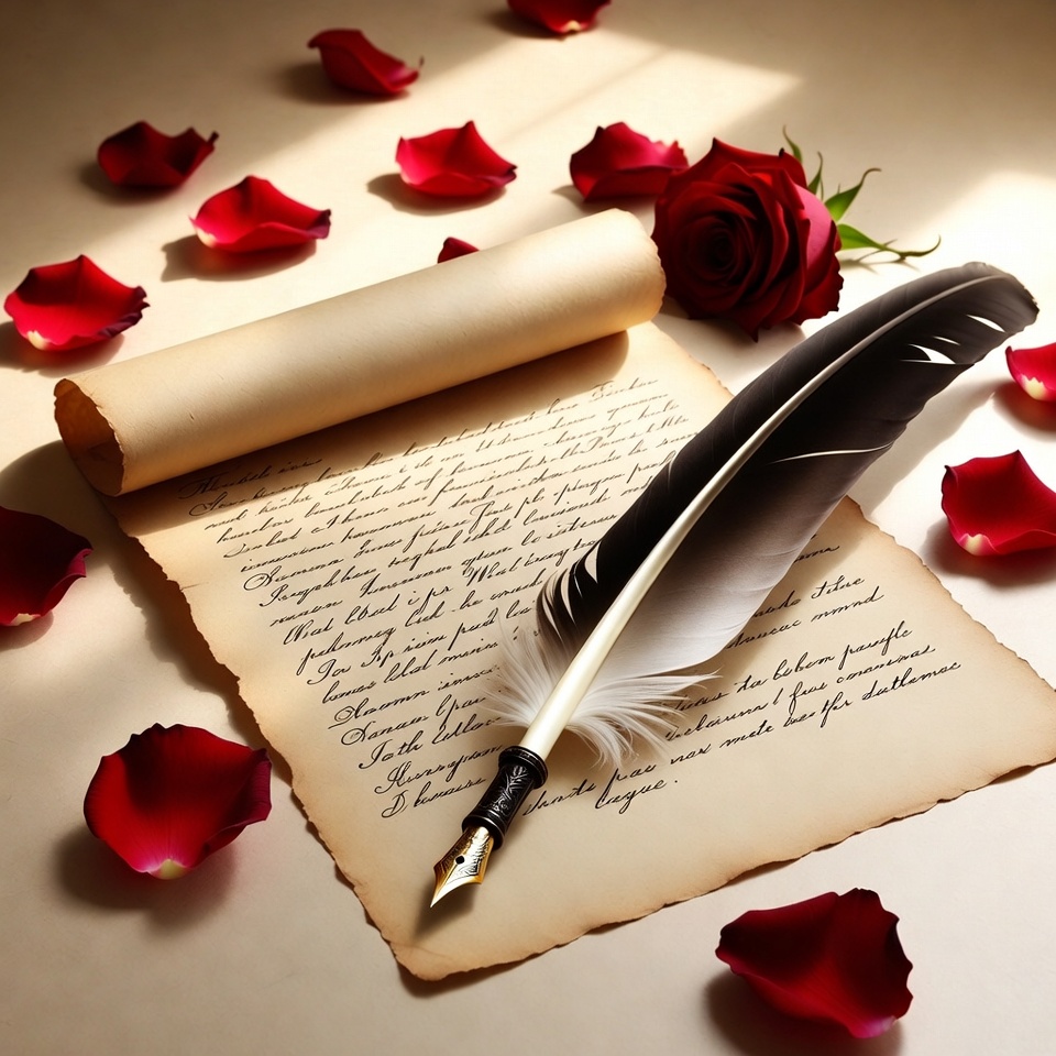 A quill and ink rest on an old parchment. Nearby are red rose petals, creating a romantic setting for writing or reflection.