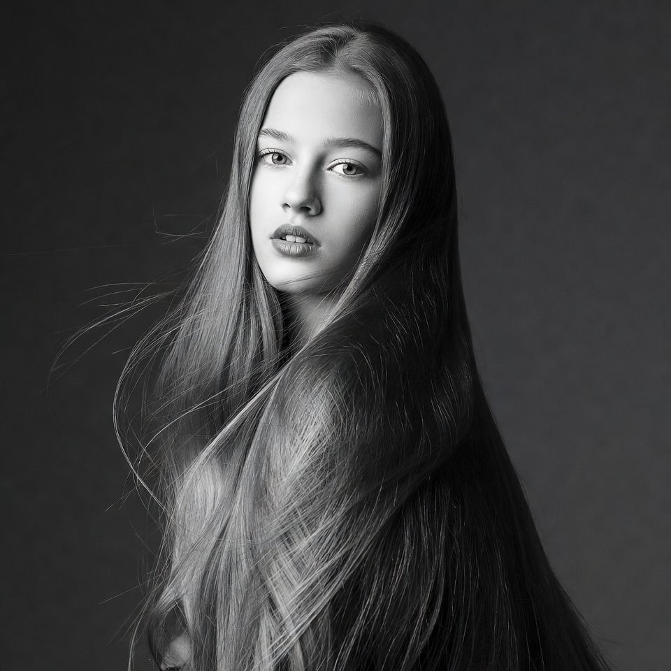 Young model poses in a studio with long hair flowing freely. Simple background emphasizes the subject's expression and style.