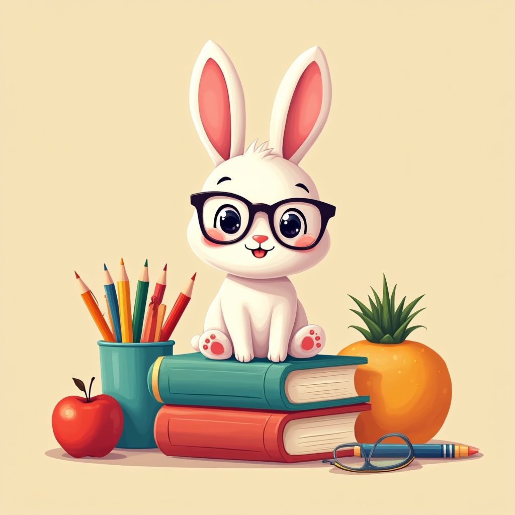 A rabbit wearing glasses sits on books. Pencils and an apple are next to the rabbit. An orange and a pineapple are nearby.