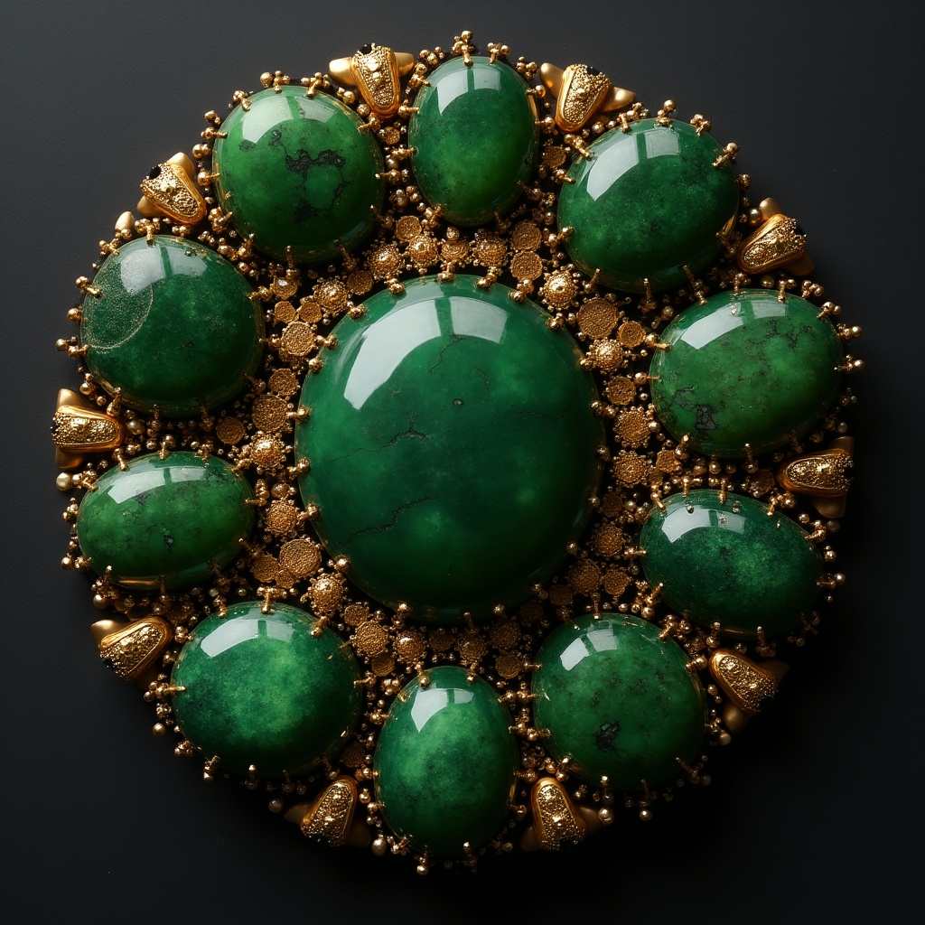 A round piece of jewelry features green gemstones arranged in a floral design with gold accents. It is set against a dark background.