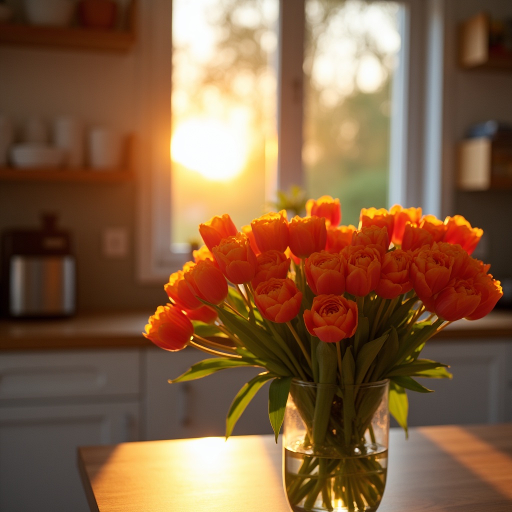 Fresh orange tulips stand in a clear vase on a kitchen table. Sunlight shines through the window, marking the end of the day.