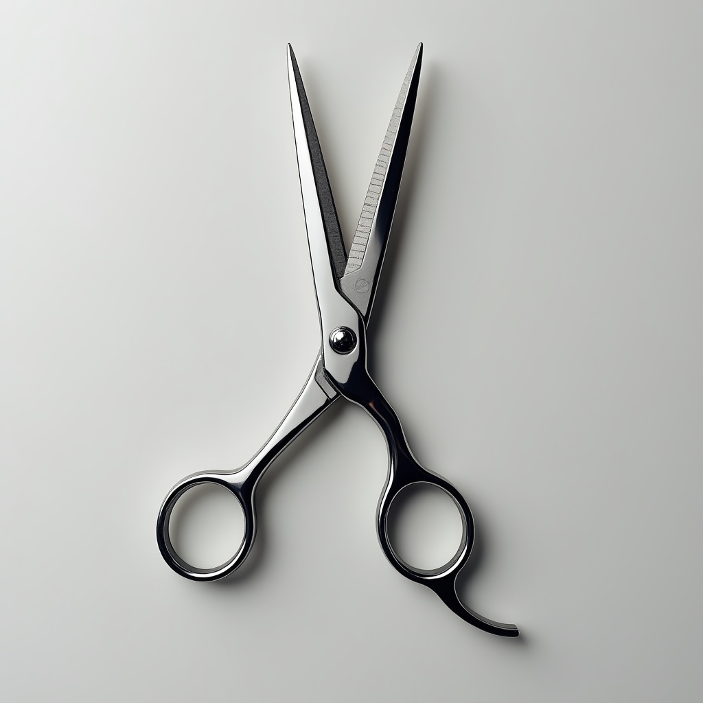 Scissors lay open on a light background. The metal blades reflect light while the handles remain still. This setup shows the tool clearly.