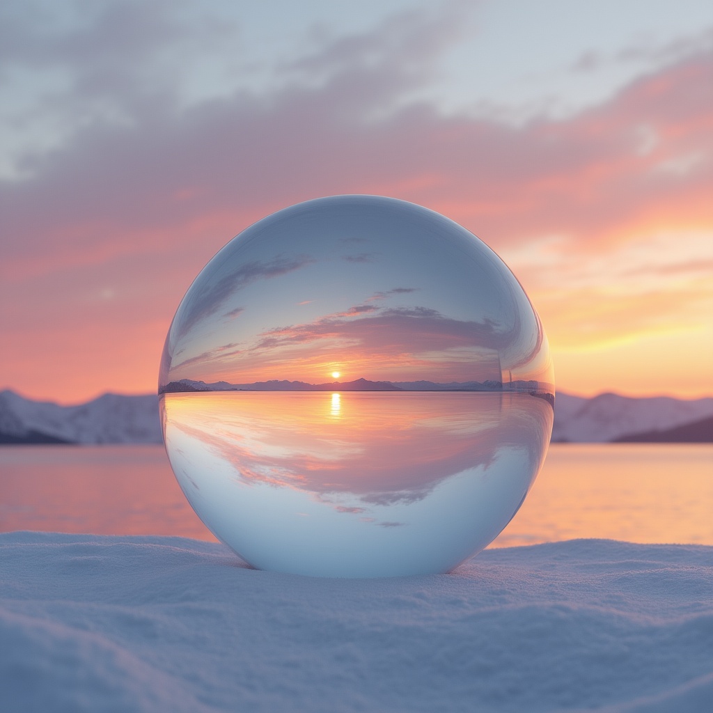 A glass orb sits on snow, showing a sunset above a lake. The colors blend in the sky and water, creating a bright scene.