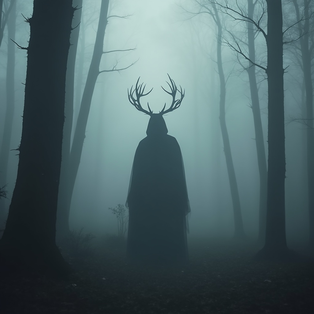 A figure with antlers stands in a dense fog in a forest. Tall trees surround this scene, creating a dark and eerie atmosphere.